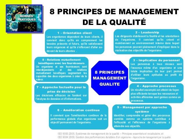 En 2015, le nombre de principes de management de la qualité est passé de 8 à 7, grâce au travail de l'équipe internationale iso/tc176.