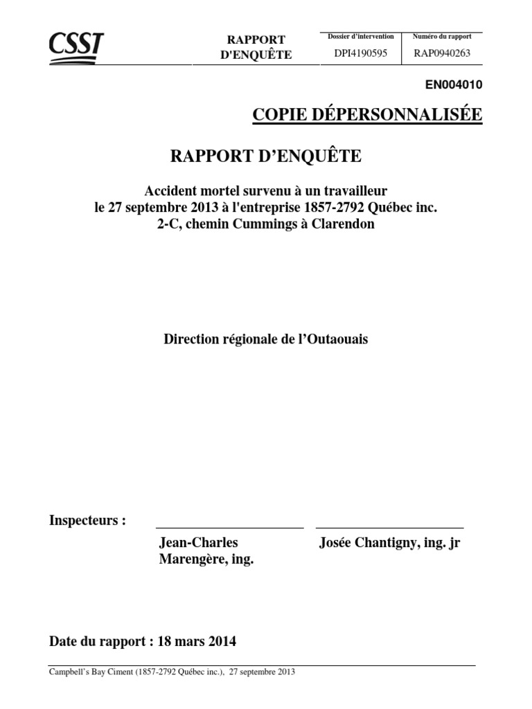 Exemple De Rapport D'enquête D'accident De Travail